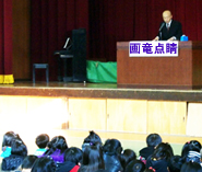 学校長の式辞は、次のような内容でした。 「3学期は1年間のまとめの学期です。 『画竜点睛』という言葉があります。 竜を描いて、睛(ひとみ)をかき入れるという意味です。 昔、中国にある名画家がいました。その名画家は、お寺の壁に白竜を描きました。今にも動き出しそうなその竜には、なぜか睛(ひとみ)が描かれていません。 不思議に思った人が理由を聞くと、その名画家は次のように答えます。 『瞳を点ずれば(描けば)、竜が飛び去ってしまうよ。』 彼が言ったとおり、睛(ひとみ)を描き入れると、白竜は本物の竜となって天高く上っていったそうです。 『画竜点睛』とはこのお話しのように、『物事を完成させるための大切な最後の仕上げ』という意味です。 3学期はまさにこの『画竜点睛』の時です。 今までの学習のまとめの時であり、次年度への飛躍のための、大切な準備の時でもあります。 登校日は50日少々しかありませんが、1日1日を大切にし、1年間のまとめをしっかりとしましょう。」 | | | | |