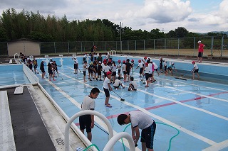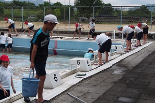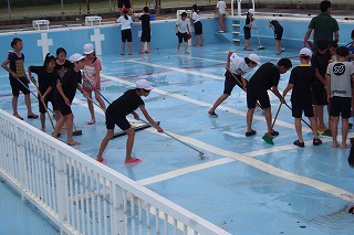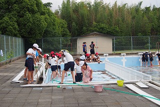 間もなく、水泳学習のシーズンがやってきます。学校のプールもその前に大掃除です。毎年、プールサイドは5年生、内側は6年生がお掃除を担当してくれています。木の葉や泥がいっぱい溜まったプールを6年生の子どもたちは、水にぬれ汗をかきながら全校のために一生懸命磨いてくれました。おかげで見違えるほどきれいになって、ピカピカの水色のプールが戻ってきました。これで全校の皆が気持ちよく泳げます。ありがとう!6年生