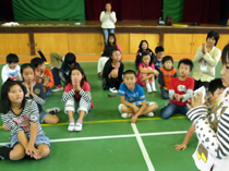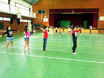 写真は、体育館で運動会で踊った「そでふれ」を披露しているところです。