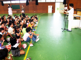 学校歯科医の大西先生と歯科衛生士の奥村先生とに、歯磨きの指導をして頂きました。