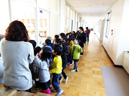 その間に、子ども達は1年生のクラスでお絵かきをしたり、みんなで並んで学校見学などをしました。