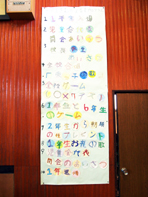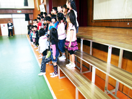 5年生のプレゼントも4年生と同じく、会場設営関係です。体育館正面に張り出されたカラフルなプログラムと、ひな壇設置がそれです。色とりどりの文字で出来たプログラムは、とても丁寧に作られていました。これも良いプレゼントですね。ひな壇の設置も上手に出来ていました。