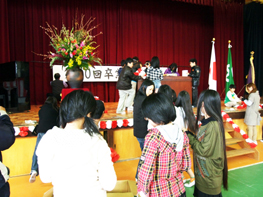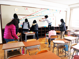 <会場の飾り付けは、人数が多くて賑やかでした。わいわい言いながら皆できれいに飾りました。>