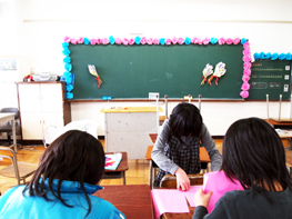 <6年の教室の飾り付けも順調に進んでいます。黒板にメッセージを書き込んだら完成です。>