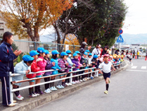 持久走のコース沿いには、たくさんの方々が来られました。 「がんばれー!」と大きな声で応援してくれる園児たち。交通整理に来られたPTA役員の方々、当番の方々。応援に来られた保護者の方々。 皆さんに見守られて、子ども達は力一杯の走りをすることが出来ました。 <写真は、園児や保護者の方々の声援を受けて走る子ども達の様子>