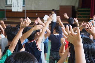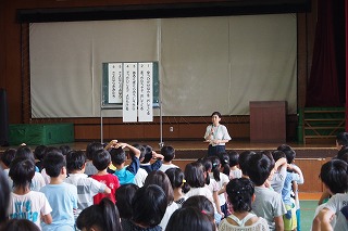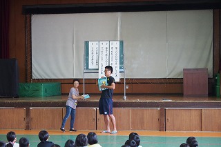 |  | |  | | 全校朝礼7月6日(水) 今日の全校朝礼は、全校みんなで、音読に取り組みました。 今年から、お昼の5分間を「音読タイム」として、声に出して詩や文を読んでいます。 今日は阪田寛夫さんの詩「夕日が背中を押してくる」の一部を、全員でいろいろな読み方をしました。 自分のペースで読んだり、ひそひそ声で読んだり、とっても速いスピードで読んだり。声に出して読む面白さや楽しさ、そして色々な読み方をして何回も読むことで、内容の理解も深める。国語の力にもつながることを目指しています。