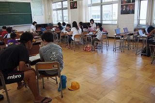 夏休みもあと僅か、残りの宿題をやり切ろうと全校学習会を行いました。プリントや読書感想文、工作などまだできていない夏休みの課題を持って、子どもたちが集まって、涼しい教室の中で、先生たちに指導して貰いながら、宿題を仕上げました。