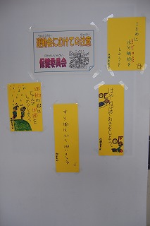 保健委員会の子どもたちが、「こまめに水分補給をしましょう」「早ね早おきをしよう」「運動の前は準備体操をしっかりしよう」「すり傷は水で洗いましょう」など、運動会に向けて健康に過ごすための呼びかけをポスターにしました。保健室の前や、校内に貼って全校に呼びかけます。