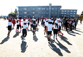 中間休みのジョギングが始まりました。 運動場に出たらまず始めに、子ども達は音楽に合わせてエアロビクスをします。身体をほぐす、準備運動です。