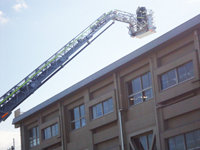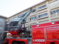 消防署からはしご車が来て、逃げ遅れた人を救出するという訓練も、子ども達は見せて頂きました。