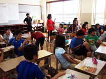 <写真1:役割を確認しているとこです。この後、運動場で動きの確認です。>