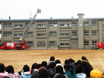 <はしご車で、取り残された人を救助する様子を見せて頂きました。>