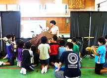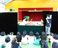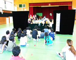 9月8日(木)人形劇の体験教室が開かれ、5年生の児童がプロの使う人形に触れる等の貴重な体験をさせて頂きました。指導はプロの人形劇団の方々です。<写真1・2:即興の劇を人形を使って演じました。人形はプロが日頃使っている貴重なものです。><写真2:舞台を裏側からのぞくと、こんな様子になっています。>本物のプロの道具に触れ、子ども達は感激していました。人形は全て、劇団の方々の手作りです。劇の内容に合わせて、一つ一つ丁寧に作るそうです。貴重な体験をさせて頂きました。有り難うございます。