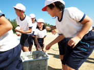 <写真3:取った球を、6年生の指示で、きれいに並べます。>