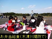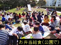 子ども達が家から持ってきたお弁当箱に給食のおかずを詰めて、公園や堤防に出かけ、遠足気分で給食を楽しみました。