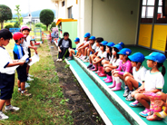 <写真1:気合い十分の3年生。やや緊張気味の園児達。はじめの挨拶をしているところです。>
