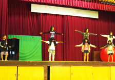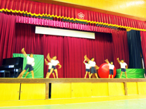 <写真1:4年生は、踊りの紹介をしました。運動会では3年生と合同で踊ります。4年生にもなると、紹介もしっかり出来ています。踊りも、迫力がありました。>
