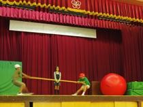 <写真3:最後は6年生の紹介です。笑いを取りながらも、決めるところは決めて、メリハリのある紹介が出来ていました。写真は、組み体操の2人技を紹介しているところです。>