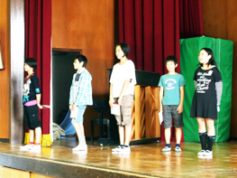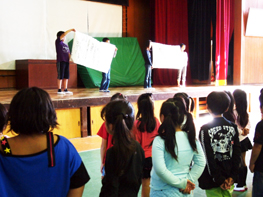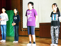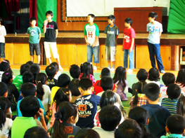 |  | |  | | 児童朝礼がありました。 盛りだくさんの内容でしたが、写真で紹介しましょう。 1 児童会の歌 児童会の歌で、児童朝礼は始まります。 歌い終わるまでに少し時間がかかるので、歌詞カードを持っている子ども達は大変です。