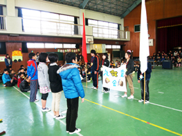 全てが終わったら、6年から5年への引き継ぎの式です。 童会の旗、色の旗を6年生から5年生に手渡しました。