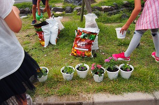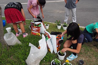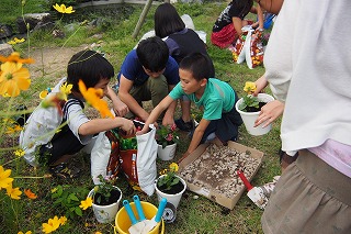 後期委員会がスタートしました。飼育栽培委員会は、みかんの木や藤袴を育てたり、池のメダカや魚のお世話をしています。今日は、秋の花の苗の植え付けをお手伝いです。学校がお花できれいになりました。