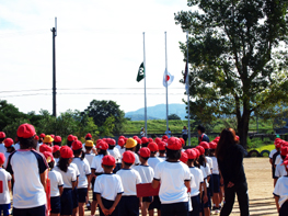 音楽に合わせて、上手に掲揚出来ていました。係の子ども達はかなり緊張しています。