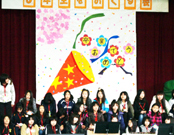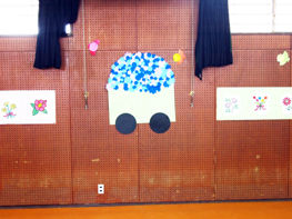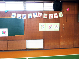 4年生は、東西の両壁面の飾りが担当です。面積が広いので、たくさんの飾りを作りました。写真で、その1部を紹介します。5年生は、ステージ上の飾りを作りました。吊り看板と、その下にぶら下げている絵が5年の作った飾りです。大きさも、仕上がりの立派さも、さすが次期最高学年の5年生ですね。また5年生は、6年生が座っているひな壇の設置もしました。