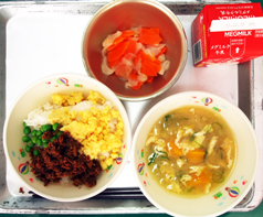 今日の給食は、三色丼・カボチャのみそ汁・こかぶの柚香あえ でした。