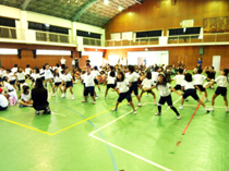 <写真1:1年生は「忍たま 四方八方玉入れの段」の紹介を、皆でしました。玉入れの前にかわいく踊りを披露し、その後に玉を入れるという趣向。少々恥ずかしそうでしたが、きちんと紹介することが出来ました。>
