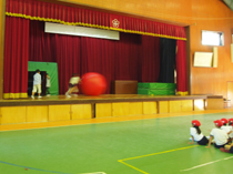 <写真3:3年生は、「レッツ!大玉ころがし!!」の紹介です。代表の子が前で分かりやすく紹介をしていました。大玉を転がすスピードが速いので、大玉がぶれて写っています。>