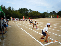 「80m徒競争」です。低学年の直線コースから、中学年以上ではカーブのあるコースになりますので、スタートも、走りも難しくなります。しかし、どの子もカーブを上手に走ることが出来ていました。