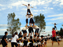 5~6人の技は皆で息を合わせることがとても難しくなります。また、人数が多いほど、全体の形を整えることが難しくなります。