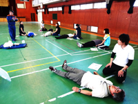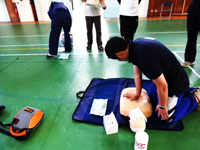 実際に119番に電話をする通報訓練をしたり、心臓マッサージをしたり、AEDを使ったり・・・。
