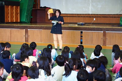 そのスタートとして、東っ子が読書に興味を持てるようにと「全校お話し会」がありました。