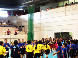 <閉会式後、他府県の選手を見送りました。出口近くの赤いユニフォームが東小です。黄色いユニフォームは、準々決勝で戦った湊川小。お互い健闘をたたえ合いました。>