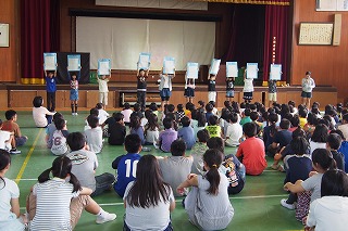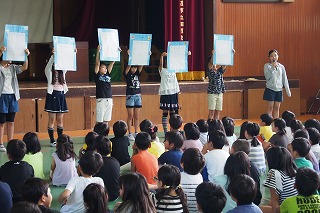 |  | |  | | 児童朝礼6月15日(水)校内をウオークラリーの表彰式です。赤白組それぞれ、上位3チームが表彰されました。 シャンリークイグループ皆で力を合わせた結果です。