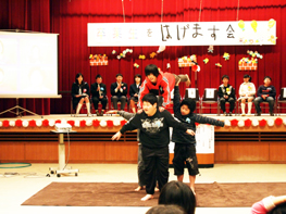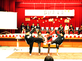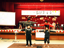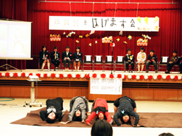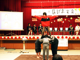 京田辺市の卒業生を励ます会が、2月15日に開かれました。 これは、市内の特別支援学級の児童・生徒が集まり、卒業生の進学をお祝いしたり、プレゼントを贈ったり、出し物をしたりして交流を深める集いです。 写真でその様子を紹介しましょう。 自己紹介と、出し物をする本校の卒業生です。 運動会で行った、組み体操を披露しています。 ブリッジをしているところです。