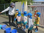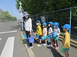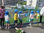 花の水やりのため、門から出てきたゆり組さん。タペストリーを見ながら先生のお話を聞いたり、知っていることを話してくれたりしました。横断歩道を渡るのも上手です!