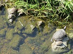 花の水やりの後、川を見て数を数えています。数えきれないほどたくさんいたのは甲羅干している亀でした。
