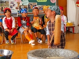 昨日年長組が餅米を洗い、いよいよお餅つき。蒸しがあがると子どもたちも味見。