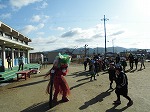 ドンドンドンドン力強い音がして赤鬼と青鬼が来ました。「鬼はそと!福はうち!」と力いっぱい豆を投げる子、先生の後ろに隠れる子、泣いてしまう子…様々な姿が見られましたが鬼を退治できました。