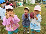 たくさん遊びました。「たのしかったー」「おなかすいてきたー」ととびっきりの笑顔でしたよ。掘りたてのお芋をふかしてもらい、ツルも佃煮風に味付けしていただきました。「おいしーーい」「もっとたべたい!」と甘くてとってもおいしかったです。