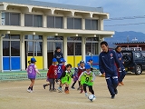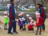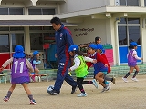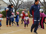 サンガ・キッズつながり隊と園庭をかけまわり、ボールでおしりタッチに大喜びの年少組、ボールを蹴るたびみてみてコール、最後はちゃっかりコーチの膝に座り込む子も。話を聞いて動く真剣な顔、コーンを倒す必死の顔、自分のチームが勝ちたいと頑張る年長組、年齢に合わせ色々な体験が出来ました。もじゃもじゃコーチ、よっしーコーチ有り難うございました。