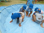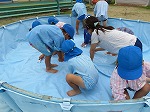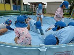 年長ゆり組がプールを出して、きれいに掃除をしてくれました。「きれいになってきた!」「ごしごし楽しいな」と歓声をあげ、楽しみながら掃除をしてくれましたよ。なんでも遊びに変えることができる子どもたちです。雨が続きますが、夏本番に向けて準備完了です。楽しみですね。