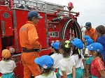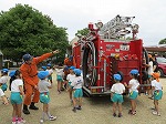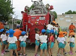 避難訓練や防火教室の後、ミニ消防車に乗せて頂き大きな消防自動車に触れながら説明を聞きました。消防士さんの姿にあこがれ、消防自動車を運転してみたいと夢ふくらむ幼児もいました。