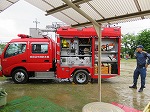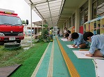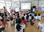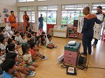 避難訓練の様子を消防士さんに見ていただき、静かに落ち着いて避難できたことをほめてもらいました。花火の扱い方を教えていただいたり、映画を見せてもらったりしました。