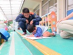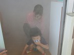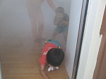 次に煙体験をしました。火事になった時に煙を吸い込まないようにするためにハンカチで鼻と口を押え、体を低くして避難することを教えてもらい、一人ずつ体験しました。