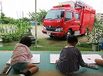 年長ゆり組は消防車を見ながら絵を描きました。大きい、カッコいい、憧れ…の気持ちを絵で表現しました。