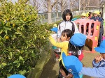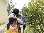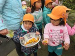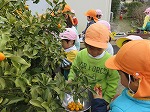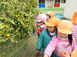 きんかんが実り、みんなで収穫しました。「まだ食べていないのに、いい匂いがするよ」「あーいい匂いでお腹すいてきた!」と言いながらオレンジ色のきんかんを「これおいしそう!」ととりました。