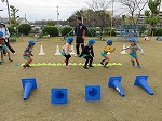 4歳児すみれ組。ウォーミングアップからスタート!!倒さないように、踏まないように気をつけて…